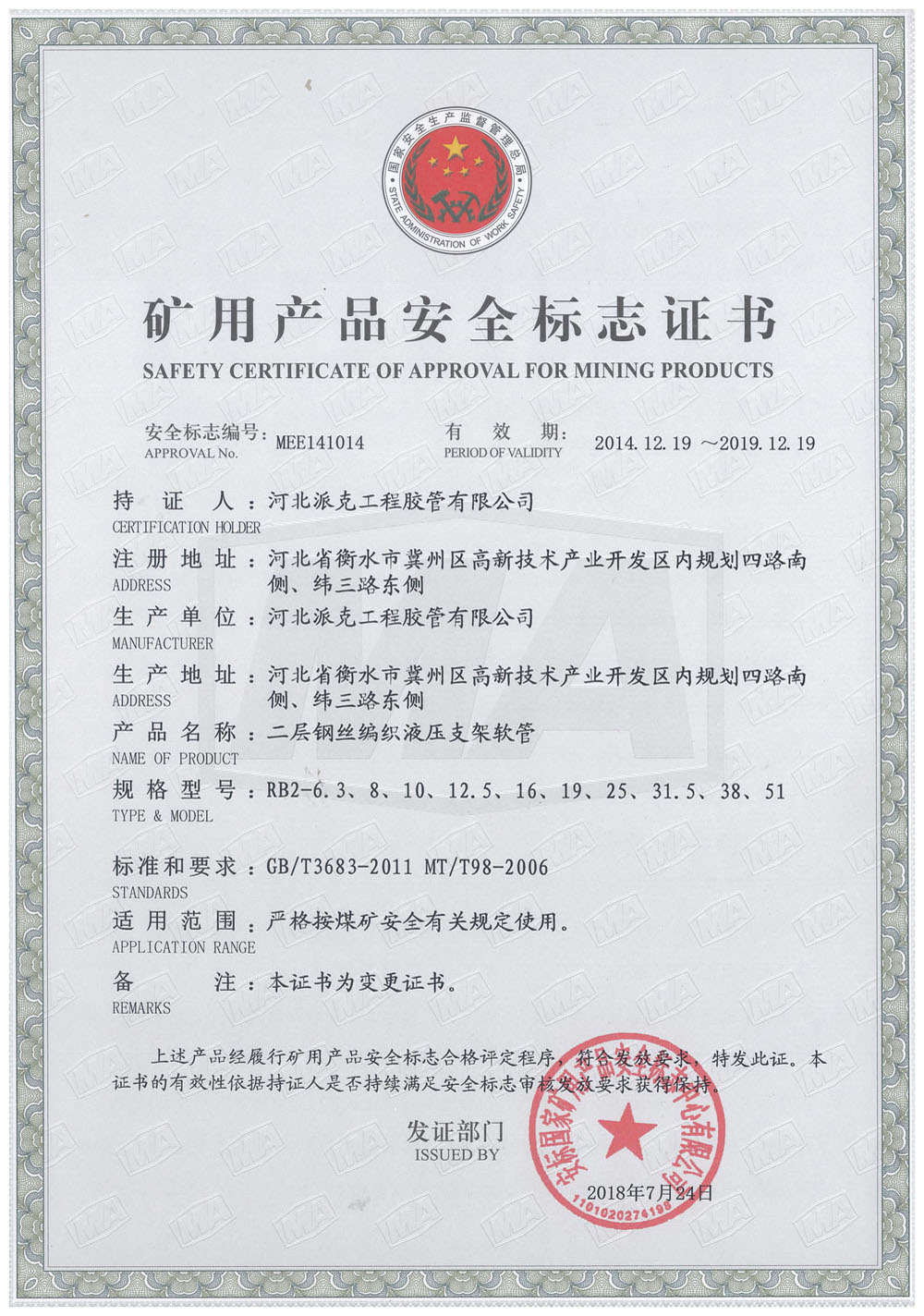 煤礦井下抽放瓦斯用橡膠連接軟管證書